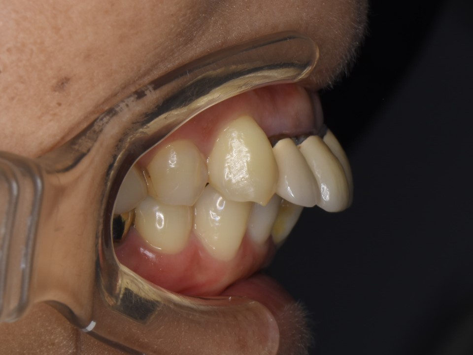 治療後口腔内。右側下顎臼歯部はインプラントにて欠損補綴を行った。下顎前歯部はクラウディングの改善のためMTM(部分矯正)を行っている。下顎前歯の歯列が改善したことにより、上顎前歯の前突(出っ歯)が解消されてことが分かる。
