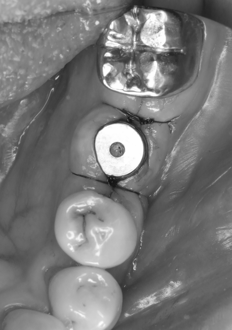 抜歯後。抜歯と同時に抜歯窩へ人工骨を填入し(リッジプリザベーションという)、歯槽骨と歯肉の温存を図った。