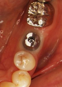 インプラント治療後。スクリュー固定のオールセラミッククラウンにて補綴を行った。インプラント治療では、他の歯に一切負担をかけずに治療をすることが可能。