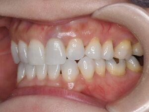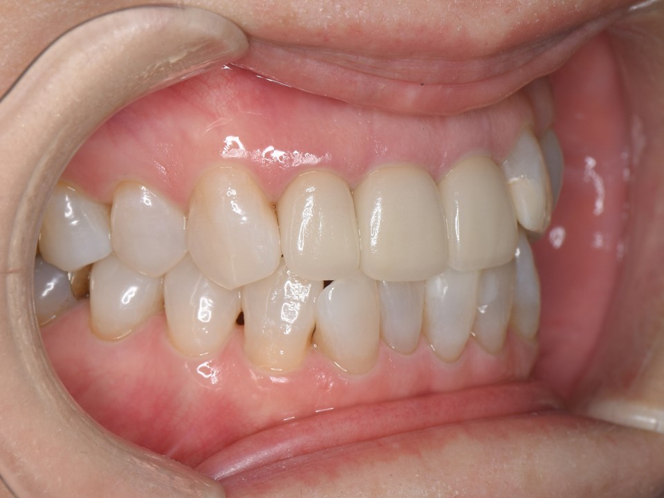 治療後口腔内。オールセラミッククラウンによる審美修復を行った。下顎前歯部はクラウディングが存在していたため、噛み合わせの改善を目的として部分矯正を行た。抜歯をせずに治療できたことは、患者さんにとって非常に有益であろう。