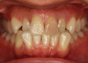 初診時口腔内。転倒により左右の上顎中切歯2本を強打して歯冠歯根破折を生じ、近医にて応急処置を受けた。歯肉からの悪臭、疼痛および審美障害を訴え来院。前歯部の噛み合わせが深く(過蓋咬合)、下顎前歯はほとんど見えない。このようなケースでは、矯正装置を装着することが困難なため、矯正的挺出を行うことは難しい。