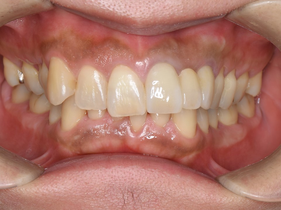 治療後。左側中切歯をオールセラミッククラウンにて補綴(ほてつ)を行った。主訴である審美障害は改善され、白く輝く美し口元になった。